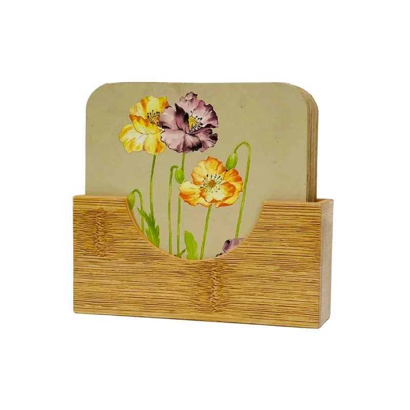 6 Pcs Wooden Square Coasters & Plastic Holder 9cm (Random Designs)