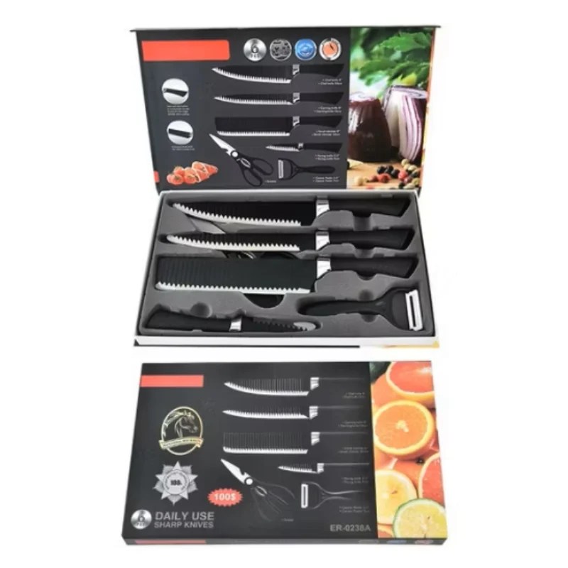 6 Pcs Black Corrugated Kitchen Knives Set with Scissor & Peeler