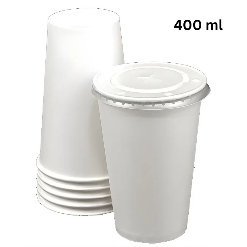 Disposable Paper Cup White 400 ml with Clear Straw Lid – 10 Pcs