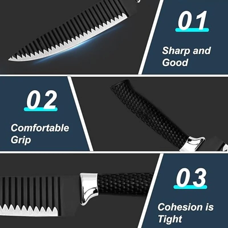 6 Pcs Black Corrugated Kitchen Knives Set with Scissor & Peeler